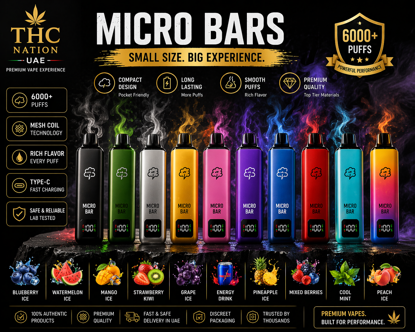 Micro Bar Premium Disposable Vape is a premium adult-use vape range offered by THC Nation UAE. Choose from multiple flavor profiles and nicotine strengths for a tailored experience. Optimized for customers searching for premium disposable vapes in Dubai and across the UAE.
