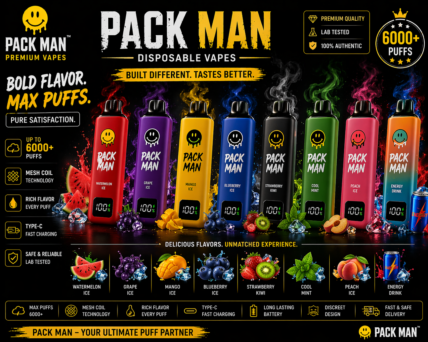 Packman Cool Mint Disposable Vape 8000 Puffs is positioned as a premium adult vape option for customers seeking elegant presentation, smooth performance, and dependable quality. Offered through THC Nation UAE, this product fits a luxury vape shop experience with fast UAE delivery, polished service, and a strong focus on authentic adult-use vape products. Best suited for customers searching for premium vape UAE, vape Dubai, and trusted vape delivery across the Emirates.